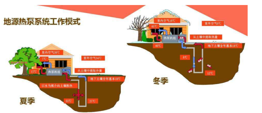 我们都知道,如今我们使用的能源有很大一部分都是不可再生能源,用一点就少一点,地源热泵技术属可再生能源利用技术。地源热泵是利用了地球表面浅层地热资源(通常小于400米深)作为冷热源进行能量转换,既能供暖又能制冷的高效节能环保型空调系统。利用土壤深处的恒温特性(全年在18℃左右),通过输入少量的高品位能源,实现低温热源向高温热能的转移。其地源热泵的COP值达到了4以上,也就是说消耗1KWh的能量,用户可得到4KWh以上的热量或冷量,真正做到“节“尽所能。