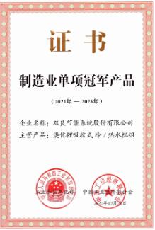 制造业单项冠军旨在引导制造业企业专注创新和质量提升,在更多细分产品领域形成全球市场、技术等方面领先的单项冠军地位,提升我国制造业国际竞争力,促进我国产业整体在全球产业链中迈向高端,对中国制造企业来说这是至高的荣誉。双良的溴化锂吸收式冷/温水机组早在2017年入选第二批制造业单项冠军产品,2021年通过最新复核,中国制造业单项冠军的入选是对双良多年来精耕细作持续创新的肯定。
