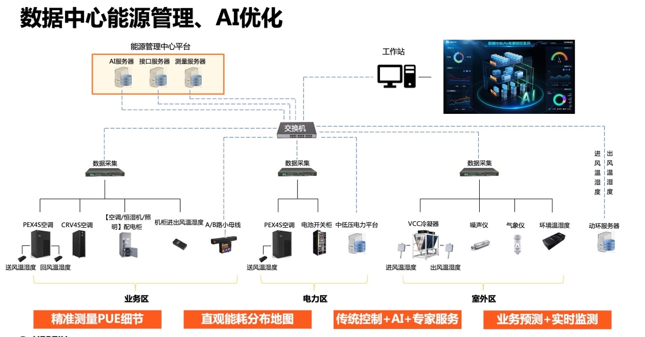 雷爱民还特别列举了深圳某项目的案例——“我们首先建设一个独立的AI系统,作为整个数据中心的能源管理平台,这样就可以采集数据中心的各空调的参数,比如机柜前门的温度、UPS电池充电的能耗、室外机运行的温度以及室外的天气、噪音等等。根据这些数据,系统中的节能程序就可以按照房间精准测量每一个系统的PUE,方便管理人员后续对能耗较高的平台进行优化,也形成了非常直观的能耗分布地图,让数据中心的运营一目了然”。