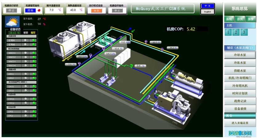 可提供一体机群控系统,基于用户实际负载特性,制定冷量输出策略。并结合室外温湿度数值,确定合理的冷却水温目标及冷却塔组合模式。控制界面也可实时显示系统能效及运行数据,并将运行数据提供客户。
