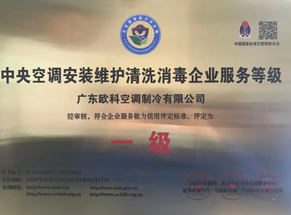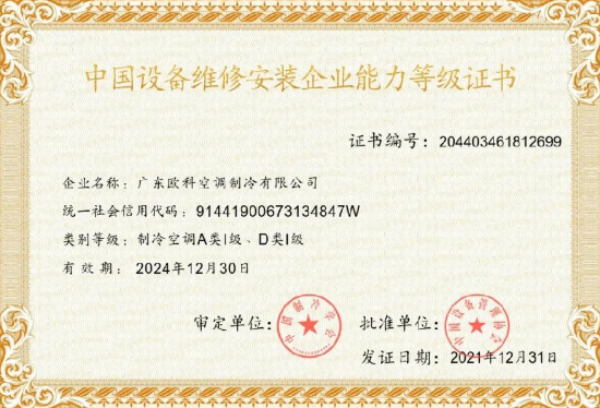 “中国设备维修安装企业能力等级证书(制冷空调A类Ⅰ级、D类Ⅰ级)”则由中国制冷学会和中国设备管理协会认证颁发,皆是行业认可的权威认证。