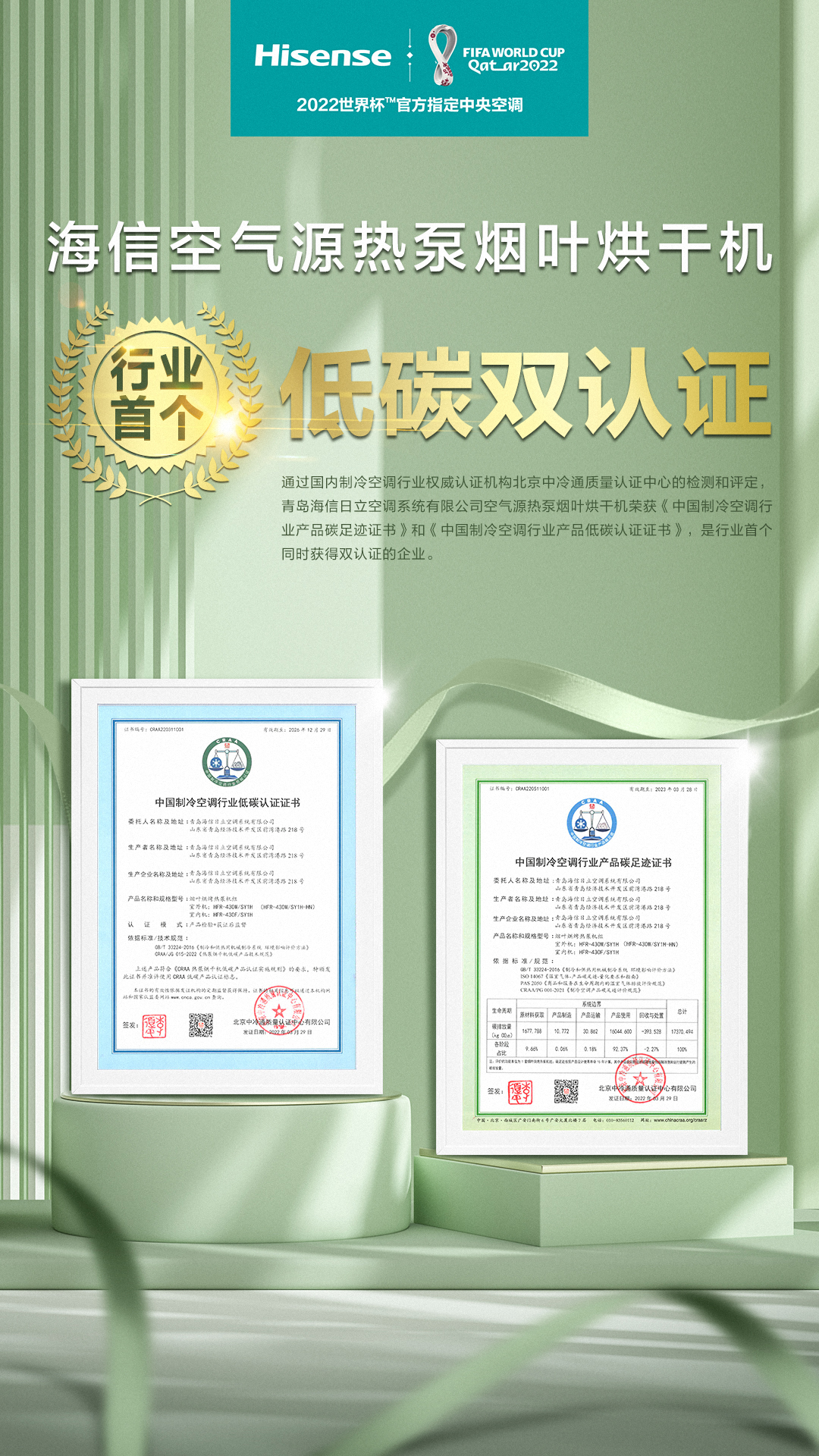 青岛海信日立空调系统有限公司由此也成为行业内首家同时获得空气源烟叶热泵烘干机产品低碳双认证的企业。