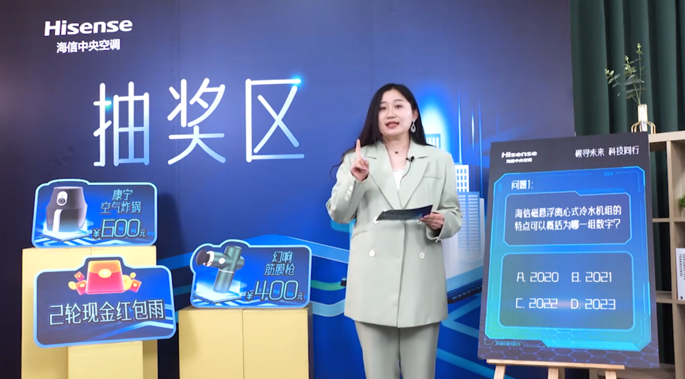 以“碳寻未来·科技同行”为主题的海信中央空调直播间,万人在线互动,氛围火热。海信中央空调水机运营总监李强、海信中央空调水机技术支持工程师禹洋、海信中央空调产品企划经理孙慧琳来到现场,为线上网友深度讲解高效节能的中央空调是怎样“炼”成的。