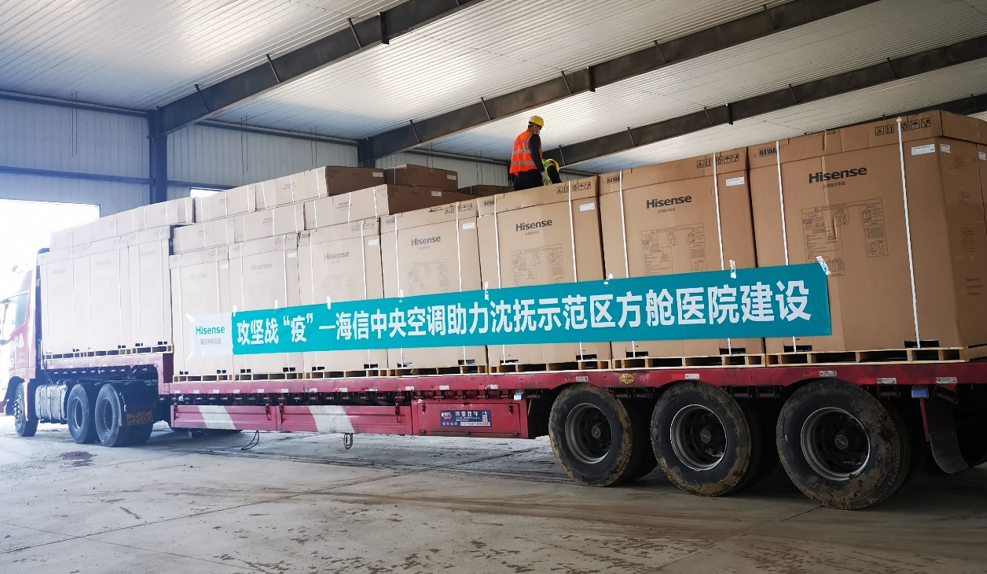 此次在接到沈阳沈抚示范区方舱医院的配套建设任务后,海信中央空调以最快速度协调生产、运输等各个环节,将百余台产品送达至施工现场。