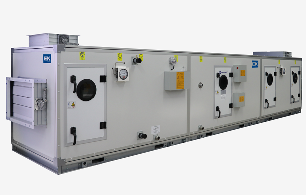 EKDM组合式空气处理机组风量范围从990 ~300000m³/h,有新回风混合段、表冷段、加热段、初、中、高效过滤段、电加热段、加湿段、阻性消声段、热回收、二次回风段、风机段、均流段等超40种功能段可供选择,不同功能段的组合可以满足不同的空气处理需求。该机组严格按照欧标EN1886设计制造,并已通过美标AHRI认证和国标GB检测。