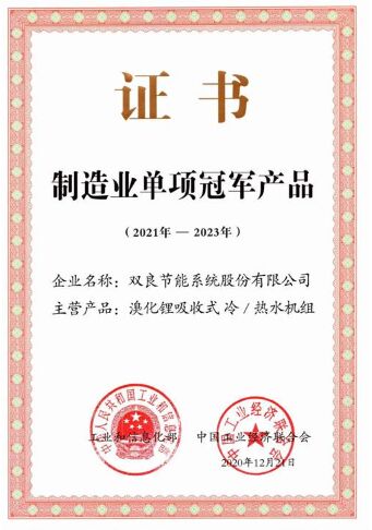 双良溴化锂吸收式冷 / 温水机组荣获由工信部、中国工业经济联合会共同颁发的“ 中国制造业单项冠军产品 ”证书。