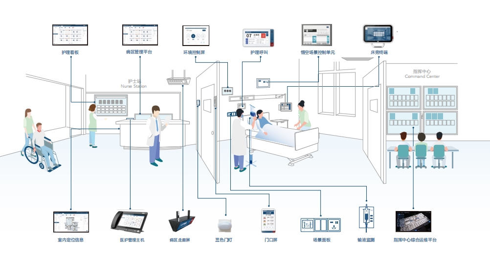 美控「悟空」实现了从系统集成到空间场景的变革。通过悟空场景控制单元,美控智慧病房让医护人员、患者、后勤管理、运营管理、紧密联系在一起,提高医疗资源的利用率,确保公共卫生安全。同时,帮助医院推进以患者为中心的智慧病区,提供优质的医院服务,并扩展到针对关键任务的智慧病区应用的集成平台和服务。