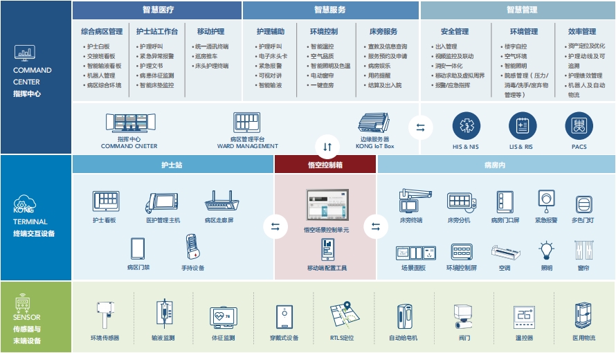 具体来说,美控打造了一个悟空产品矩阵,通过传感器与末端设备(环境传感器、输液监测、温控器)进行控制和数据监测,会将数据信息传递反馈到终端交互设备(护士看板、医护管理主机、病区走廊屏、床旁终端、病房门口屏、空调、照明、窗帘),实现护士站与病房内的高效运转和智慧化服务,而这些终端交互设备,主要由悟空场景控制单元控制,相当于一个“核心中枢”,悟空控制箱又与上一级边缘计算平台(病区管理平台、KONG IOT Box)相连接,最终将全部数据信息,传达给运维中心,从而实现智慧医疗(综合病区管理、护士台工作站、移动护理),智慧服务(护理辅助、环境控制、床旁服务),智慧管理(安全管理、环境管理、效率管理),全局的运维和管控。