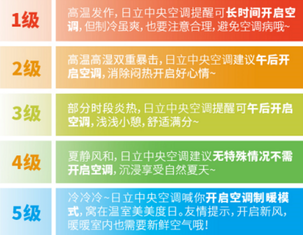 日立联合墨迹天气基于7亿用户大数据分析,挖掘不同天气情况下我们对温湿度、洁净度等几大维度的需求,通过划分五大等级,为不同级别提供相应适宜的空调使用指南,让空调真正为我们提供舒适的生活。