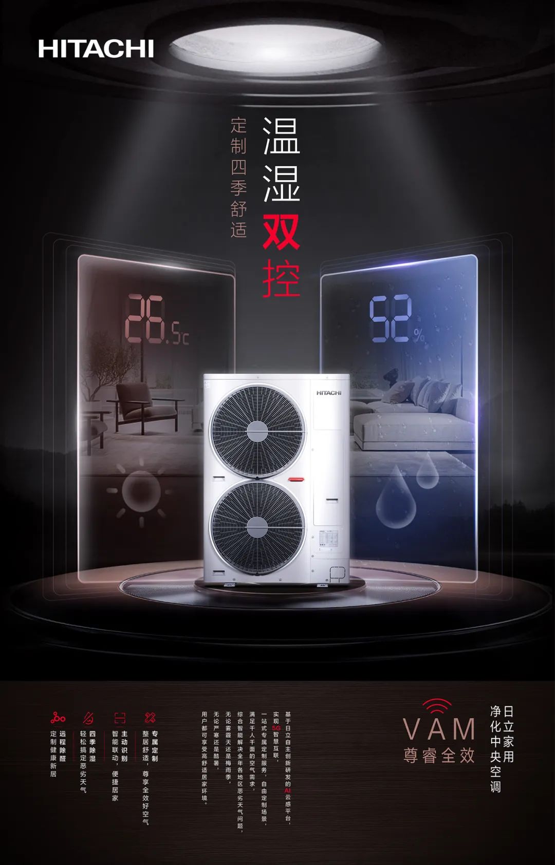日立中央空调采用创新三管制技术,通过三根冷媒管和双换热器设计,搭载56档精准调节,精确智能把控室内温湿度,黏热附身,一键清除,令人们的夏日居家生活更舒爽无忧。