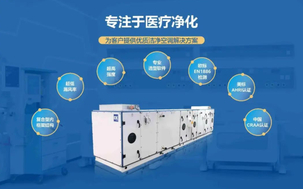 TITAN系列洁净型组合式空调机组是一款专注于医疗净化的高端空气处理机组,采用复合型内框架结构,具有超低漏风率、超高强度、不积尘、易清洗等特点。该机组严格按照欧标EN1886设计制造,并已通过美标AHRI认证和国标GB检测。
