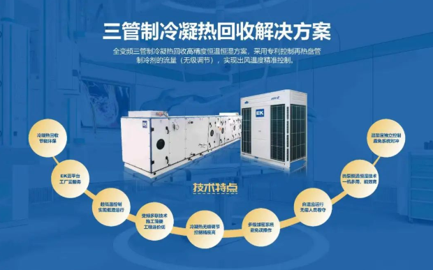 EK全变频三管制冷凝热回收高精度恒温恒湿方案,采用专利控制再热盘管制冷剂的流量(无级调节),实现出风温度精准控制。该机组集送风、制冷、热回收、供热、加湿、除湿、空气净化及电气控制组合为一体,适用于医院手术室、ICU、PCR实验室等需要恒温恒湿的场所。