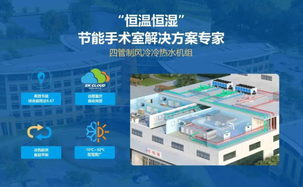 EK四管制风冷冷热水机组拥有目前行业最先进的冷热自动平衡技术,可同时制冷制热,自动匹配末端冷热需求,冷热同机,帮助用户节省一套系统费用。该机组节能效果显著,综合能效达8.67,相比传统空调+锅炉系统节能60%,是手术室等“恒温恒湿”场所的最佳选择。