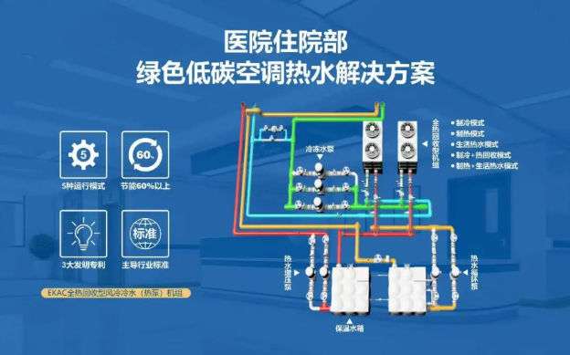 EKAC全热回收型模块式风冷热泵机组采用国际领先的EK专利(专利号:ZL 201010566341.7)第三代全热回收系统设计,最大热回收量可达158kW,领跑行业。机组拥有5种运行模式,可在夏季制冷的同时,免费提供生活热水,特别适用于有全年热水供应需求的住院部。
