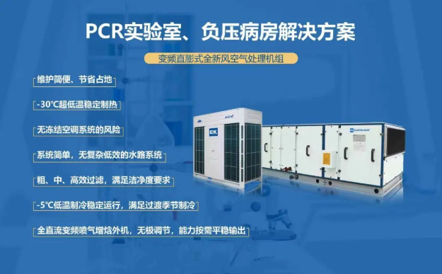 EK变频直膨式全新风空气处理机组具有粗、中、高效过滤段,满足PCR实验室、负压病房不同级别洁净度要求。机组运行范围广,可做到-30℃超低温稳定制热,-5℃低温制冷稳定运行,无冻结空调系统的风险。机组采用全直流变频喷气增焓外机,系统简单,无复杂低效的水路系统,维护简便、节省占地面积。