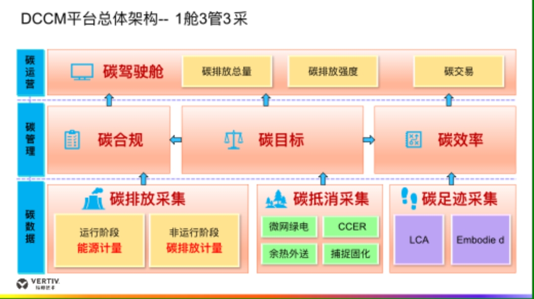 曲鑫强调,电管能管并不等于碳管,碳管理应超脱于能耗管理范畴,这点也可从国标地标团标对数据中心电、能、碳的实施过程中得到印证。同时,兼顾施行标准和实际需求两方面,才能设计出更贴近客户的实用系统。V-DCCM是一个针对碳的全生命周期管理平台,架构上采用了1舱3管3采的三层设计理念,从而有效破解企业碳管理的各种难题。