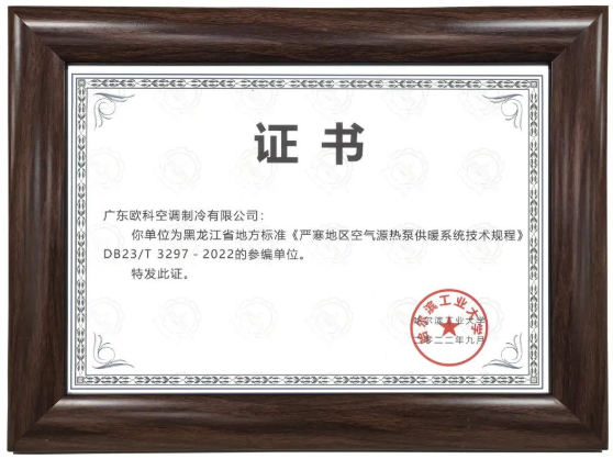 近日,经黑龙江省住房和城乡建设厅和黑龙江省市场监督管理局批准,由哈尔滨工业大学主编的黑龙江省地方标准《严寒地区空气源热泵供暖系统技术规程》正式发布并实施。广东欧科空调制冷有限公司(简称:EK空调)作为参编单位,参与了该标准的制定。