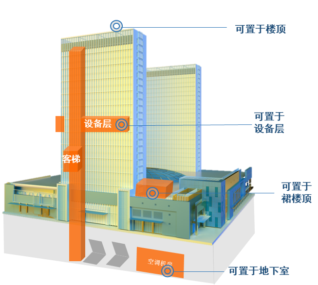 需求:部分项目机房空间小,通道狭窄,常规冷水机组无论运输过程中的装、卸工作还是工地吊装就位,都需要使用大型的吊装设备,安装现场往往需要面临破墙、拆装机组、机房扩建等问题,造成较高的施工难度;部分项目建筑面积小,无单独机房。