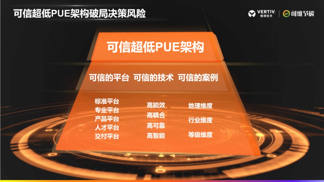 面对如此复杂的决策风险,“可信超低PUE架构”基于“把复杂交给维谛,把简单留给客户”的理念,可以帮助客户破局PUE交付风险。该技术架构包括了“可信的平台、可信的技术、可信的案例”,提供高能效、高耦合、高可靠、高智能的方案,而且覆盖了不同地区、不同行业、不同等级的数据中心,在PUE交付上,能够实现最佳性价比的全生命周期交付。