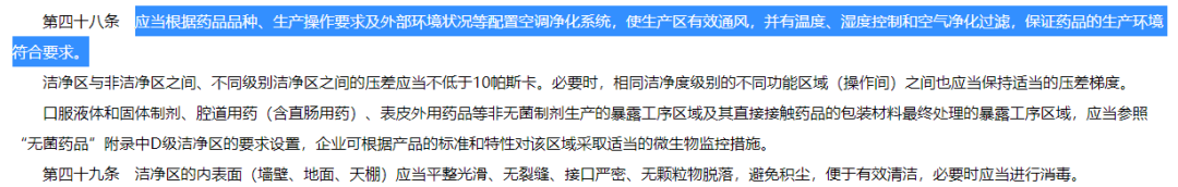 药品生产质量管理规范(2010年修订)》(GMP)中规定:应当根据药品品种、生产操作要求及外部环境状况等配置空调净化系统,使生产区有效通风,并有温度、湿度控制和空气净化过滤,保证药品的生产环境符合要求。