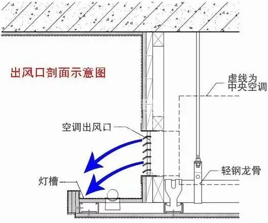 室内机应安装在厚度与房间吊顶不发生冲突的场所,特别注意当使用风管侧吹时,考虑装饰造型的高低差及下拉吊顶的内宽度,尤其是灯槽会严重阻挡气流,在运行制热模式时影响会更大。