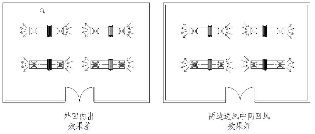 在大空间(如宴会厅、会议室等)布置风管式室内机时,宜以“中间回风、两边送风”的气流组织方式布置室内机。