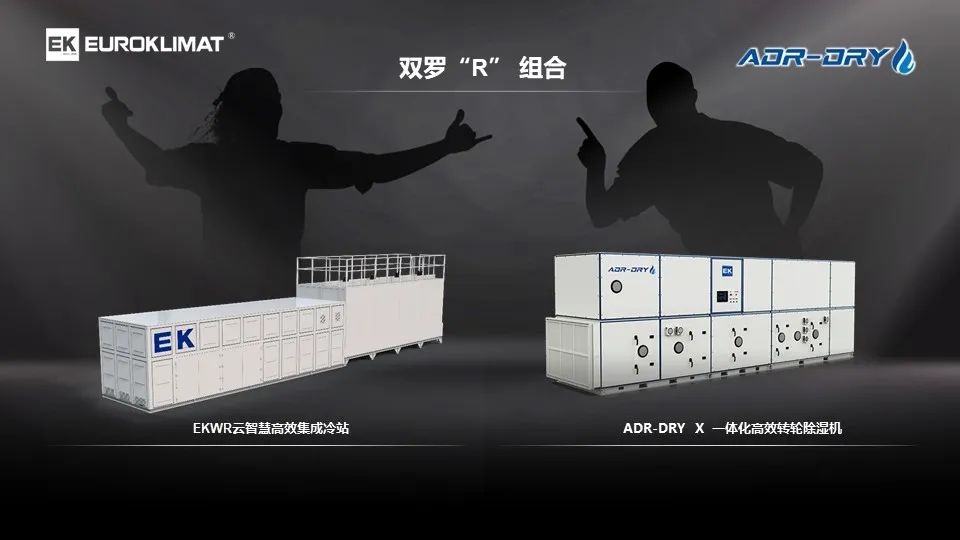 双罗“R”组合高效除湿系统:由EKWR云智慧高效集成冷站和ADR-DRY X一体化高效转轮除湿机组成。