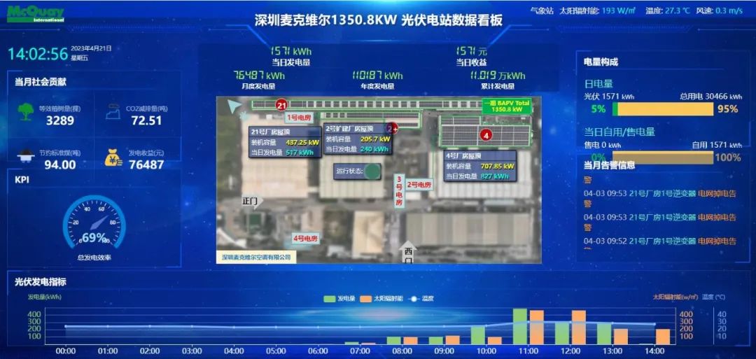 2022年底,麦克维尔深圳基地率先启动太阳能光伏发电系统建设项目。历时4个月,麦克维尔深圳基地10000㎡太阳能光伏发电系统落地建成。预计年发电量达137万千瓦时,用于补充生产车间及实验室日常用电,可实现减碳约1300T/年(按深圳市碳核查提供碳排放因子0.9489计算),相当于植树58910棵,节约419T标准煤。