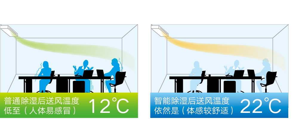 虽然降温可以降低蚊子的活跃度,但我们也不能为了除湿而降到过低的温度。我们机组采用智能再热设计,对除湿降温后的空气进行再热升温,避免向室内送入空气温度过低,提高舒适度。
