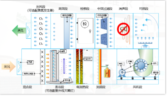 以上是一个涵盖了最常见功能段的组合式空气处理机组,我们以不同的功能段的维护保养来为大家一一分解。
