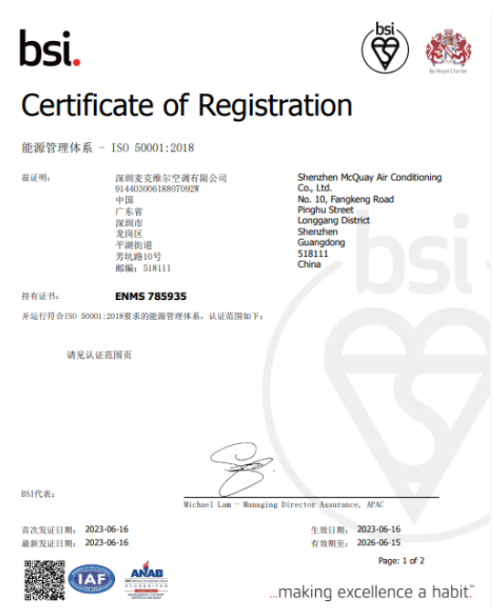 近期,麦克维尔深圳工厂获得《能源管理体系ISO 50001:2018证书》,标志着公司能源管理体系建设取得关键性成果!