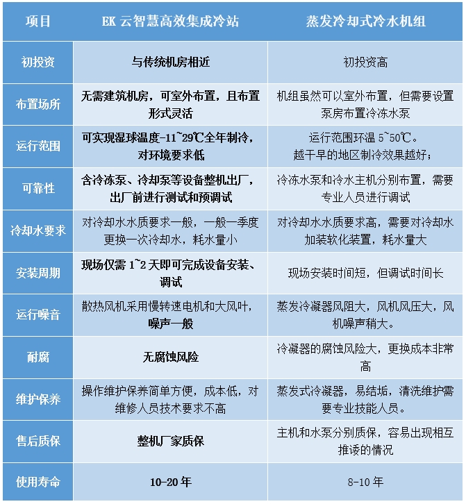 EK云智慧高效集成冷站是一款系统级、集成一体化高效节能产品,可在湿球温度-11℃以上全年稳定高效制冷,机房系统能效EERao最高可达6.0,全年综合运行费用较传统机房节能可高达49.55%,具有安装、调试时间短、节省机房空间以及能效突出等优势,可帮助电池企业缩减50~60天的机房建设周期。