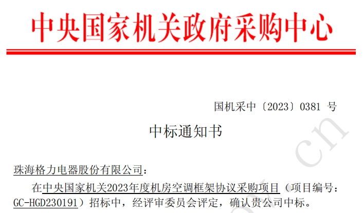 格力中标中央国家机关2023年度机房空调框架协议采购项目
