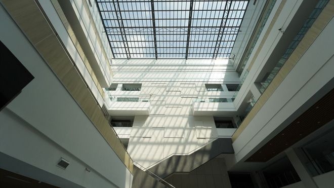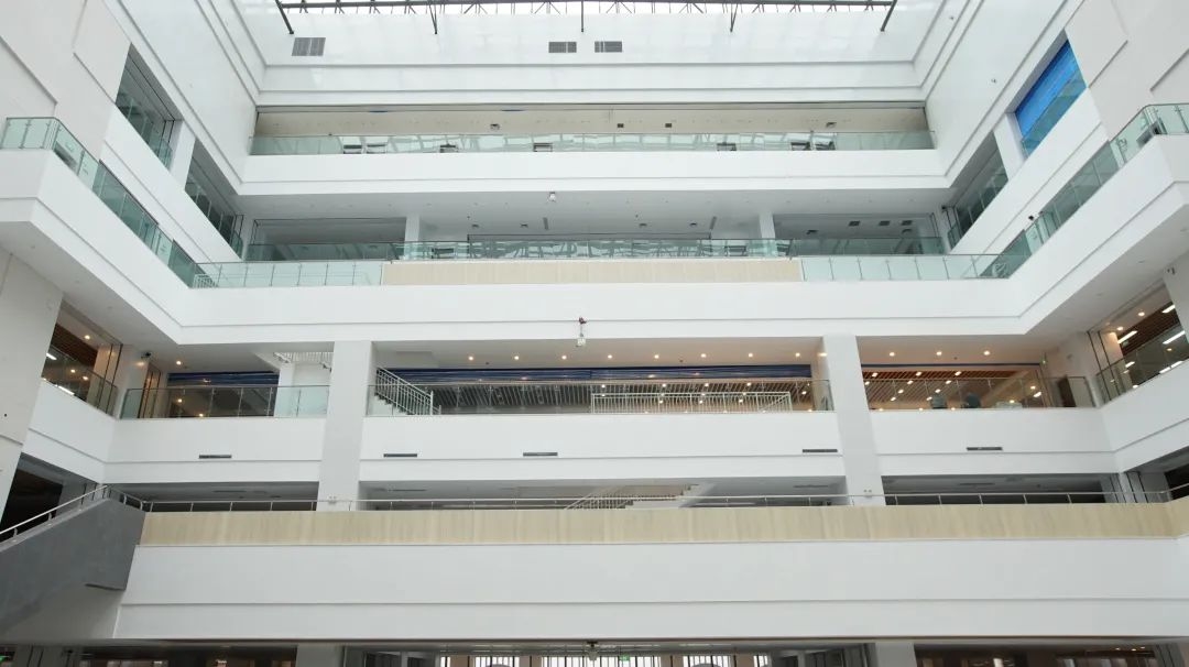 建筑室内平面采用“天井”世布局,形成大气的中庭空间,书库阅览空间环绕布置,中央巨大的玻璃天窗为中庭带来充足的阳光。