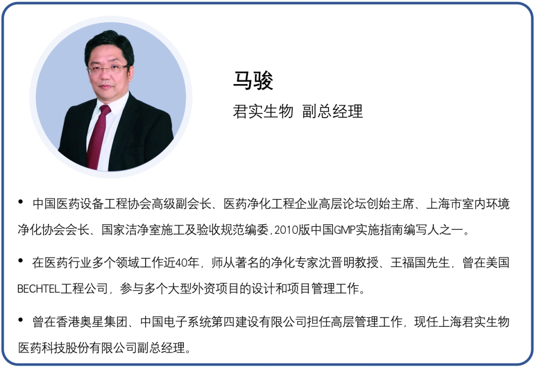 基于丰富的行业背景与经验,马骏先生以撰写人的身份参与2010版中国GMP实施指南、《洁净室施工验收规范》(GB5059-2010)等编制工作,在医药洁净室领域完成了《医药厂房B级区换气次数的研究》。
