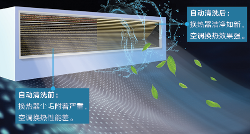 机组具备无缝自清洁技术,全方位清洗空调室内机换热器,通过室内机换热器先结冰结霜,利用表面张力的变化,将换热器上的灰尘颗粒与翅片分离,之后再进行化霜处理,将灰尘颗粒通过水泵带走排出室内,最后开启风扇快速控干,保持机组干爽,防止细菌的滋生。