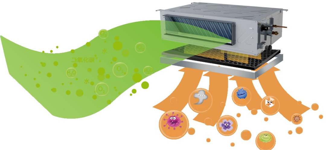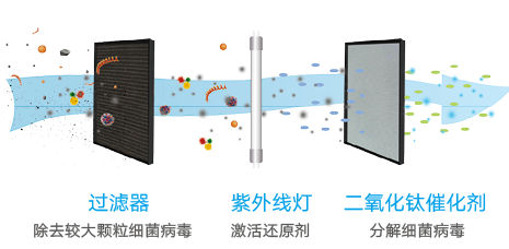 纳米级二氧化钛光触媒杀菌滤网,高效杀菌,效率高达99%以上,通过纳米光照射在纳米级二氧化钛催化剂的表面,形成强氧化力的自由基(·OH)和超级氧化离子(O2-),它们能分解各种细菌、病毒等,将任何有机的碳氢化合物氧化分解成水和二氧化碳。