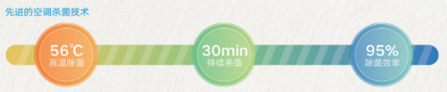 家用多联机采用56°C高温杀菌技术,通过精准的升温技术,将室内机换热器翅片温度提升至56℃以上,灭杀附着在空调上的细菌及病毒等,灭菌效率高达95%。