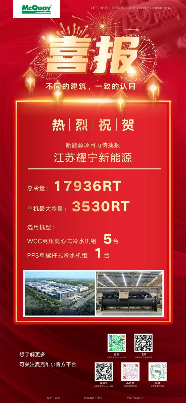 除耀宁新能源外,麦克维尔还为青岛海湾化学、合肥华晟光伏科技、淮安天合光能、盐城亭湖天合光能等多个化工、光伏、锂电项目提供了WCC大冷量高压离心机,持续赋能工业发展。
