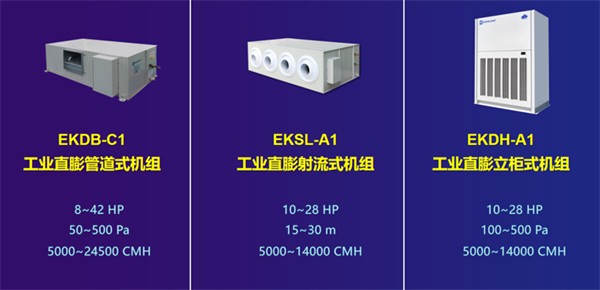 EK空调主推的工业多联系列机组:EKDB-C1直膨管道式机组、EKSL-A1直膨射流式机组、EKDH-A1直膨立柜式机组,其作为工业级产品,为工业领域的众多仓储提供专业、高效、节能、稳定、舒适的温控、温湿双控中央空调解决方案。