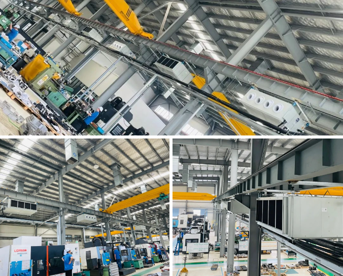 EK推出的带射流喷口的EKSL-A直膨射流式机组,其应用完美克服工业厂房空调安装难的问题,让工人享受绿色环保的空调环境。
