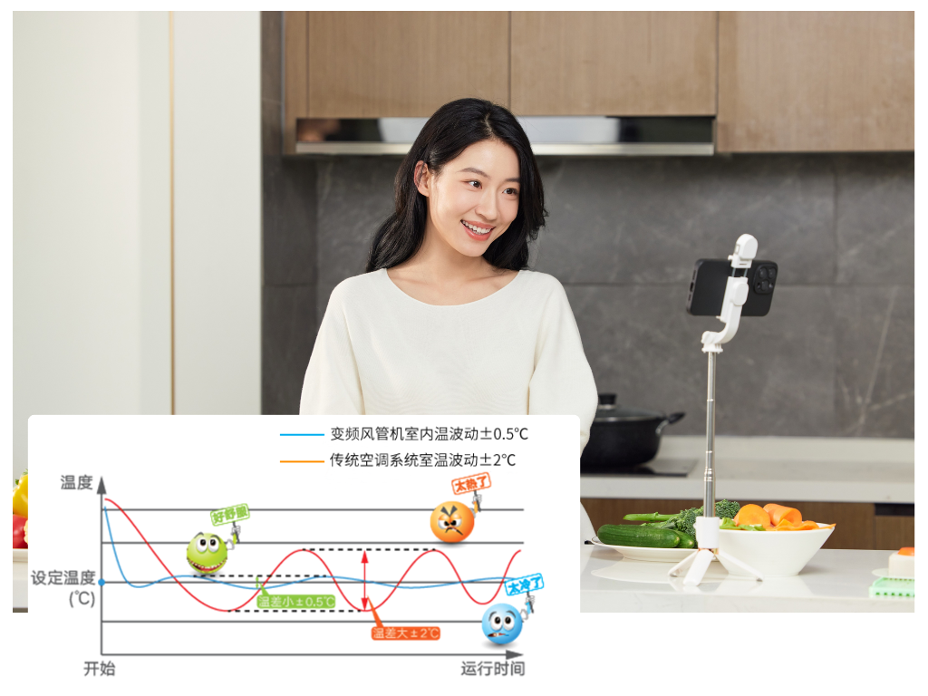 ◎ 制冷可采用机组回风口的感温探头,制热可采用线控器内置的感温探头,温度波动控制±0.5℃,室内温度波动小;