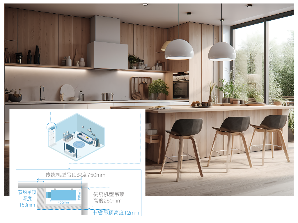 ◎198mm超薄机身,轻松安装在阳台与客厅连接处,释放更多吊顶空间;