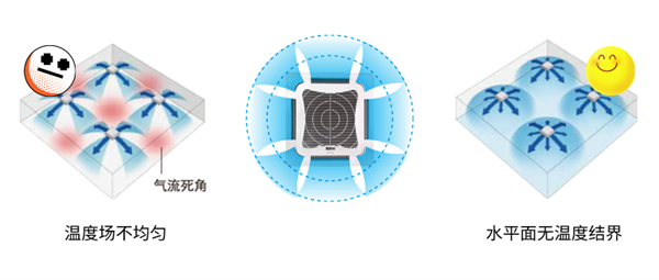 360°环形出风,多角度百叶可调,室内气流分布均匀,不存在送风死角,舒适度更高。