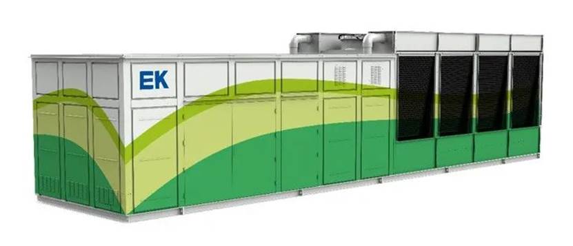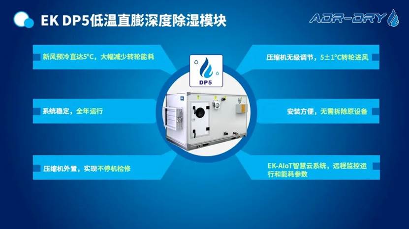其中,EK分布式高效集成冷站是一款系统级、集成一体化高效节能产品,可在湿球温度-11℃以上全年稳定高效制冷,机房系统能效EERa高达6.0,有效解决冷冻机房建设成本高、周期长,除湿系统配套冷冻机房能效低等行业痛点。