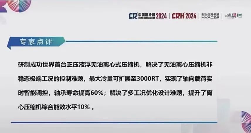 在2024中国制冷展金奖产品发布仪式上,行业专家对海信正压液浮无油离心式压缩机给予了非常高的评价,充分肯定了海信中央空调的行业领先的科技创新成果,“研制成功世界首台正压液浮无油离心式压缩机,解决了无油离心压缩机非稳态极端工况的控制难题,最大冷量可扩展至3000RT,实现了轴向载荷实时智能调控,轴承寿命提高60%;解决了多工况优化设计难题,提升了离心压缩机综合能效水平10%。“