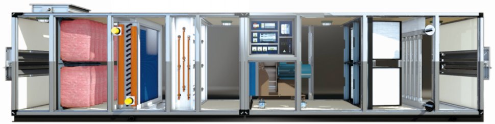 机组标配防水型电机,防护等级IP55,安全可靠。同时,由EC电机驱动的数字化新排风组合式空气处理机,保持充足的新风量,利用新风降低致病菌浓度与感染风险,同时通过乙二醇盘管进行热回收应用,杜绝交叉污染,高效节能运行。