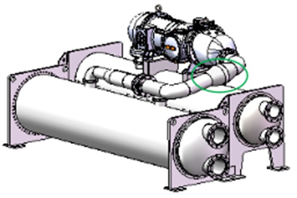 主要应用于空调螺杆机组。螺杆压缩机的噪声源主要来自排气压力脉动噪声,其噪声特性主要表现为中低频噪声偏大。抗性消声器、原理是利用赫姆霍兹共振腔来吸收声能,其优点是频率选择性强且消声幅值高。通过仿真优化计算消声器的传递损失,使消声器在特定频段产生较优的消声幅值,从而降低排气压力脉动噪声,进而降低整个机组的噪声,消声器的应用可以使整个机组的噪声降低2-3dB(A)。消声器结构小巧紧凑,无需额外占用机组空间,且压降较小,既可以满足降噪需求,又能够满足机组小型化需求,同时还能兼顾机组性能需求,极大地提升了产品竞争力和用户体验。