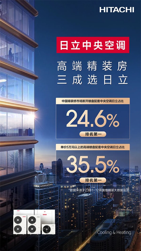 根据奥维云网(AVC)发布的2023年1-12月精装大数据显示,中国精装修市场新开楼盘配套中央空调日立占比24.6%;单价5万元以上的高端楼盘配套中央空调日立占比35.5%。日立中央空调连续3年获得精装市场和单价5万元以上的高端楼盘配套中央空调排名双第一。