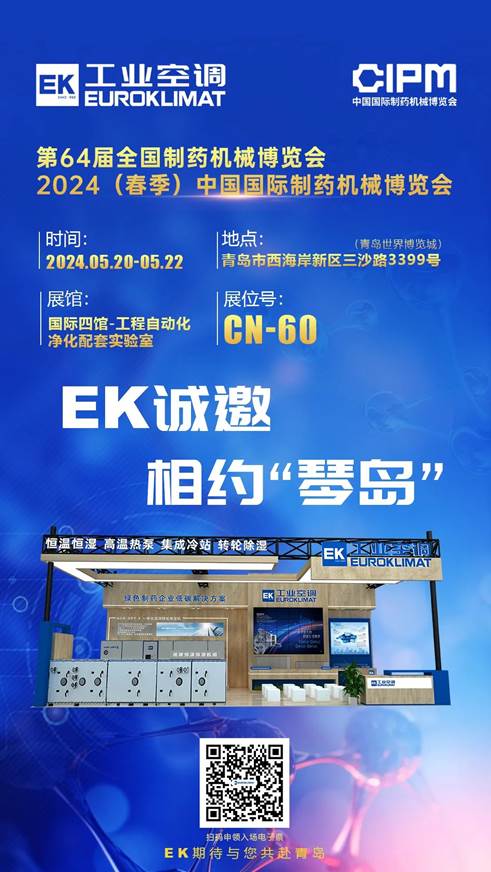 第64届(2024年春季)全国制药机械博览会暨2024(春季)中国国际制药机械博览会将于5月20日-22日在青岛世界博览城举办。作为制药行业空气处理专家,EK工业空调将携一系列绿色制药企业低碳解决方案亮相国际四馆-工程自动化净化配套实验室 CN-60号展位。